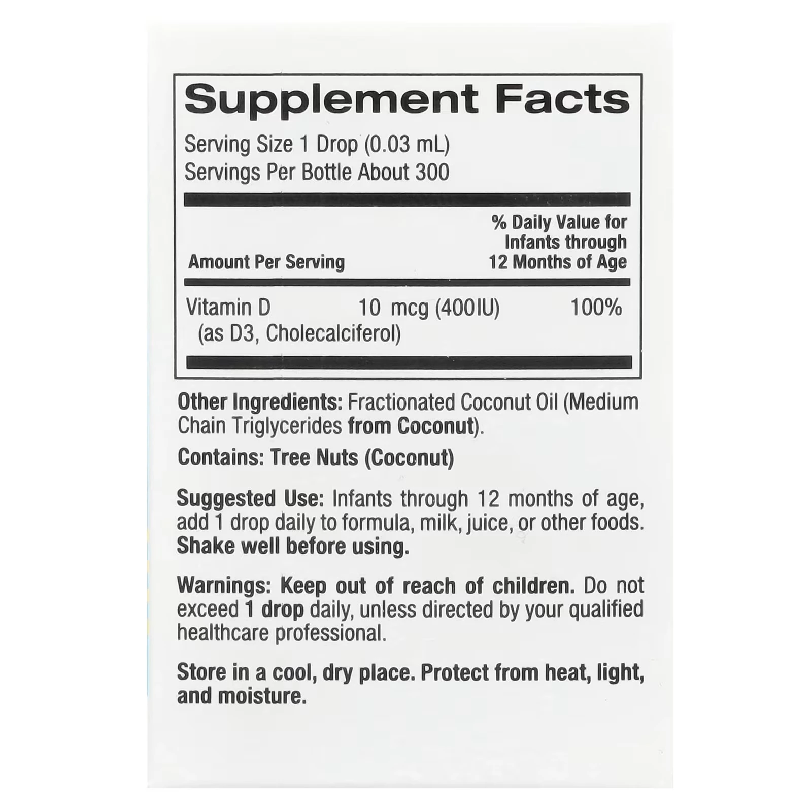 Infants through 12 months of age, add 1 drop daily to formula, milk, juice, or other foods.
